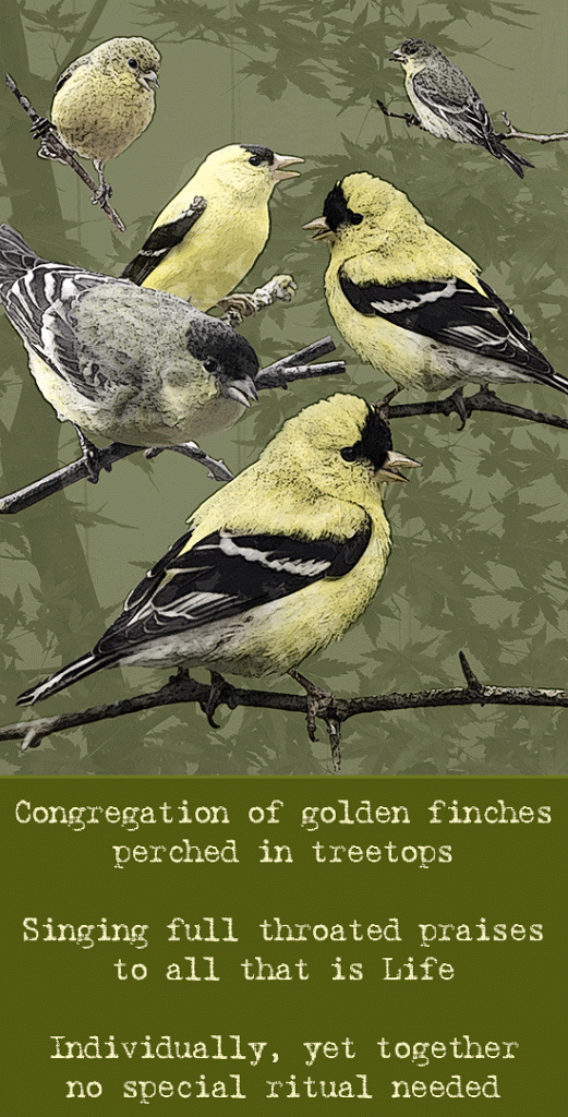 Congregation of Finches Congregation of golden finches perched in treetops Singing full throated praises to all that is Life Individually, yet together no special ritual needed - Marshal Mckitrick