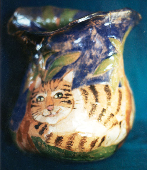 Later that year, I bought some greenware teapots to paint (with underglazes) for my sisters for Christmas. As I was sketching on the first mold-poured greenware teapot with an automatic pencil, the tip scratched the surface. Oh, my! It opened up a whole new area of exploration: carving unfired clay. The first teapot became “The Sleeping Rhinoceros on the Road to Enlightenment.”