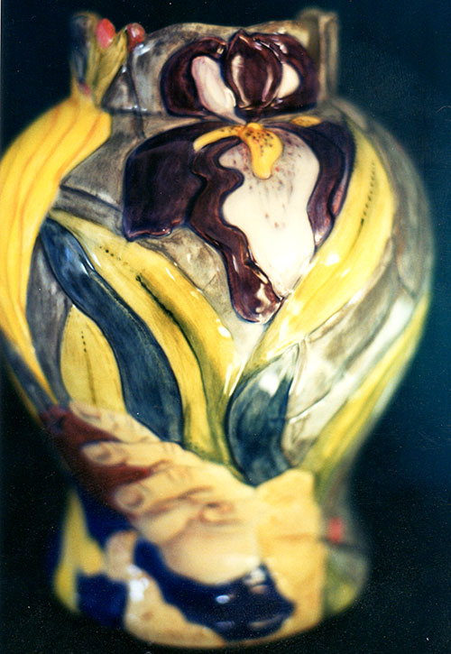 I decided I could use large commercial greenware vases as blank canvasses to carve and paint with underglazes. The lady at the greenware shop said that they were too delicate to carve. It became a challenge for me to see how much I could carve away, and paint with wet underglaze, without it just falling apart.