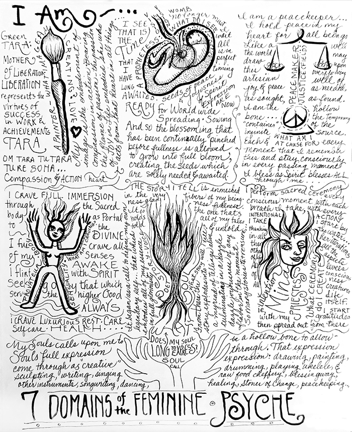 TerraTara was born from the bones of an intuitively guided self exploration process called Intentional Creativity with Shiloh Sophia. This piece talks to me of my groundedness as I embody the Mother Earth energy of Terra coupled with the compassionate heart of Green Tara. She carries the flaming torch of passion in life - a staff of JOY.